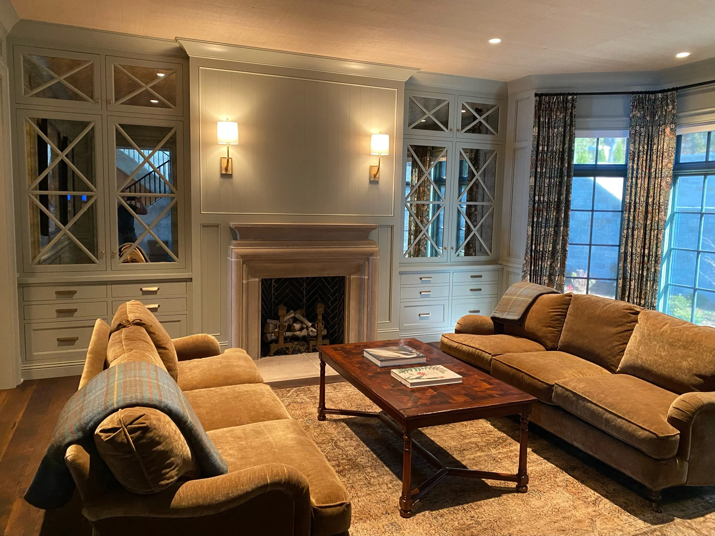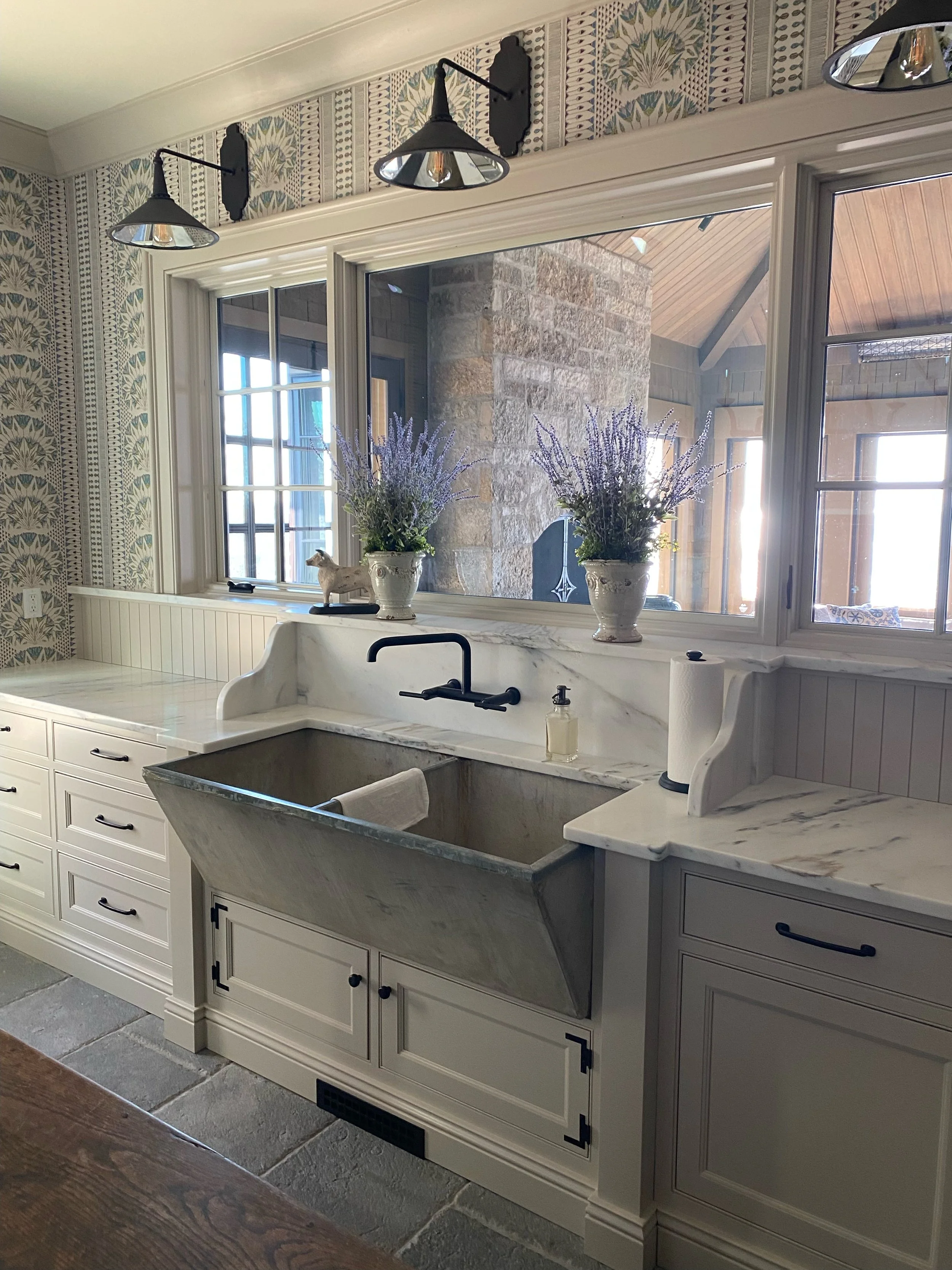 This stunning lakehouse redefines coastal style with an elevated, moody edge, creating a perfect summer retreat in Door County. Thoughtfully designed across 12,000+ square feet, every space balances beauty and functionality. A spacious yet intimate open kitchen anchors the home, flowing naturally into the living room while maintaining distinct character. Guest rooms feel just as personal as the primary suite, while the kids' wing features ensuite baths, walk-in closets, and a shared lounge. Bold wallpaper and rich color choices blend effortlessly with natural wood accents, adding depth and warmth throughout.